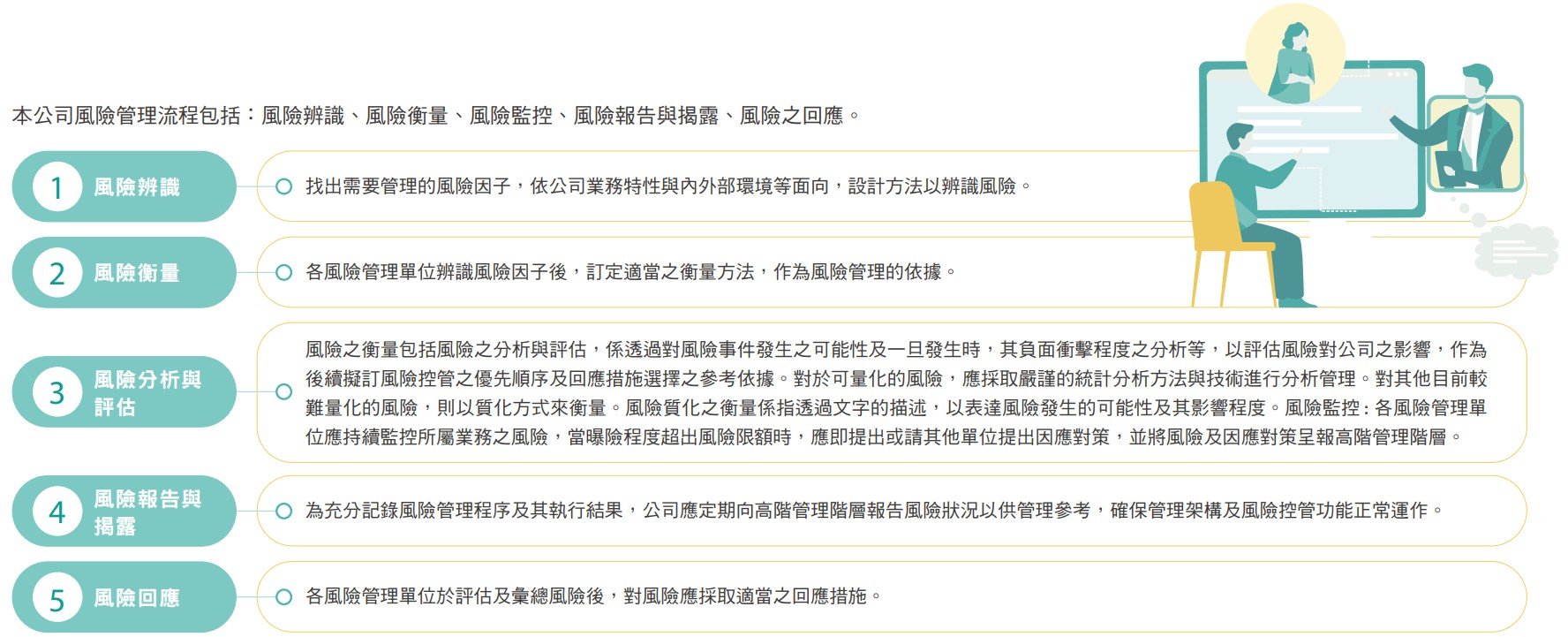 依據公司營業資產規模,以重置成本為基礎,投保商業火災險、營業中斷險、貨物運輸險等各項財產保險,以規避重大天然災害或非天災所造成營業資產損失之風險。