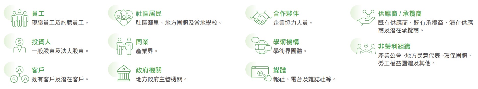 (4) 供應商/承攬商 : 既有供應商、既有承攬商、潛在供應商,及潛在承攬商。