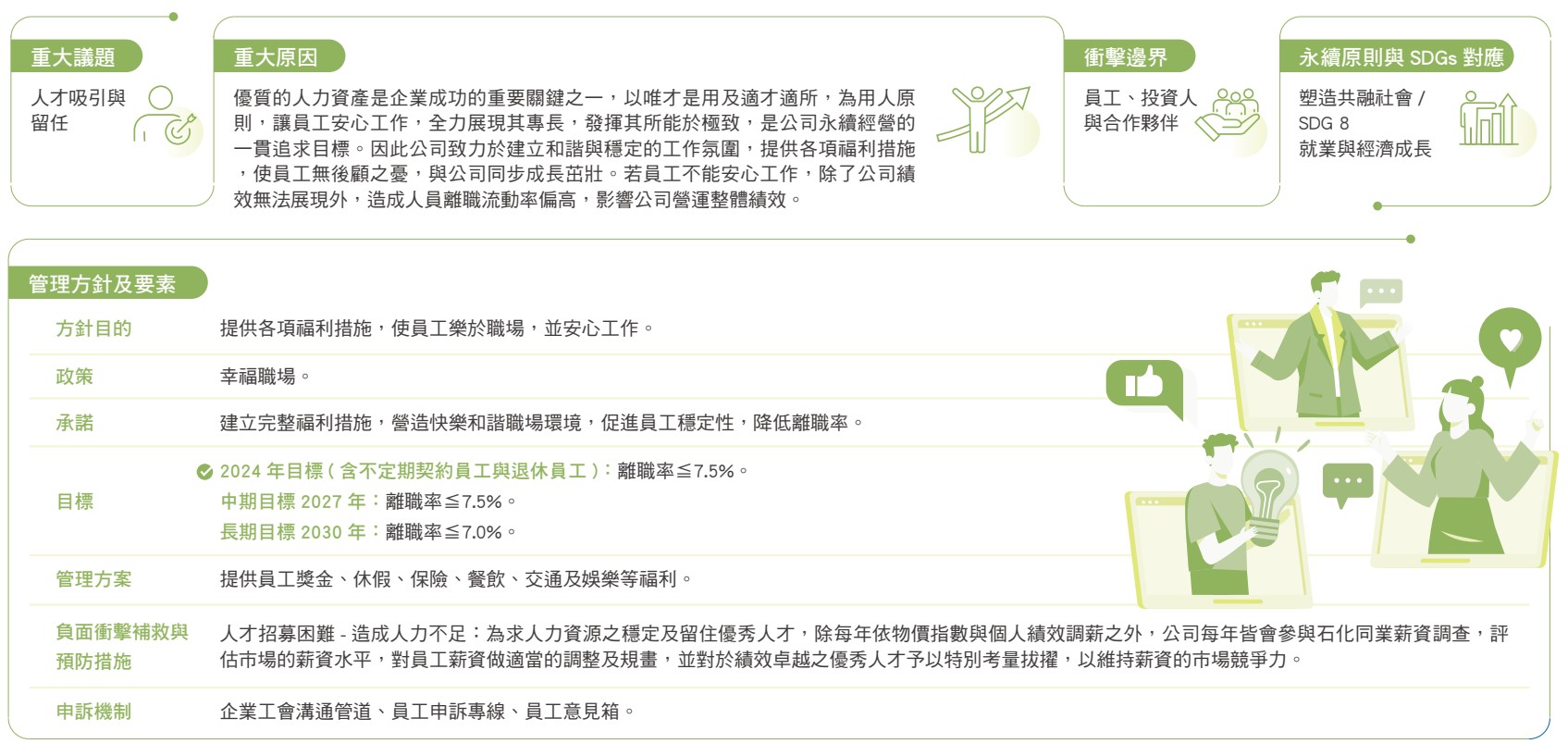 新人訓練-到職時即要求進行相關法遵宣導之新人教育訓練,內容包含:性騷擾防治、反歧視、反騷擾、推行工時管理、保障人道待遇等。預防職場不法侵害-透過宣導及公告聲明,使員工了解於執行職務過程中有責任協助確保職場無不法侵害之發生,並揭露申訴專線,共同營造友善之工作環境。