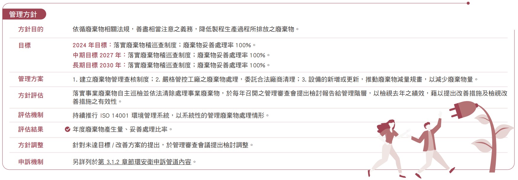 台達化公司依循廢棄物相關管理法規,委託具有合格許可證資格之清除處理機構進行廢棄物之清除處理作業,要求處理業者提供妥善處理文件,定期查訪委託之廢棄物操作管理情形、申報清除及處理量,藉由廢棄物清理車輛所安裝之全球位置測定系統進行清運路線與到達處理廠商位置是否一致之確認,不定期隨車或跟車查緝,並建立廢棄物自主稽巡查作業以落實廢棄物清除處理管理以善盡相當注意之義務,2024年共計稽巡查18次,查核結果均符合相關法律規定,持續落實廢棄物巡檢制度;各廠區統計之廢棄物產生量及妥善處理比率為100%(註:廢棄物妥善處理率,指各廠事業廢棄物均依規定委由合格之清除處理業者進行妥善處理。),達成廢棄物妥善處理率100%之目標。