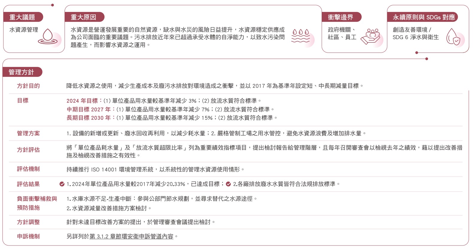 水資源管理範疇涵蓋林園廠、前鎮廠、頭份廠及中山廠,其覆蓋率達100%,依循源頭管理、製程減廢及末端管制之原則,以減少水資源需求,並強化水資源再利用與加速回收處理流程。